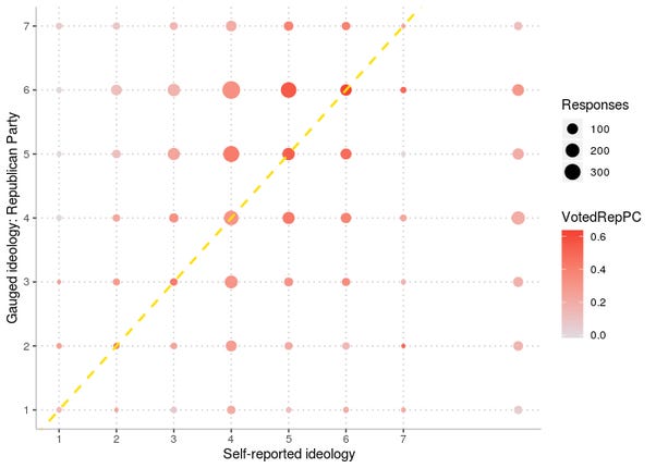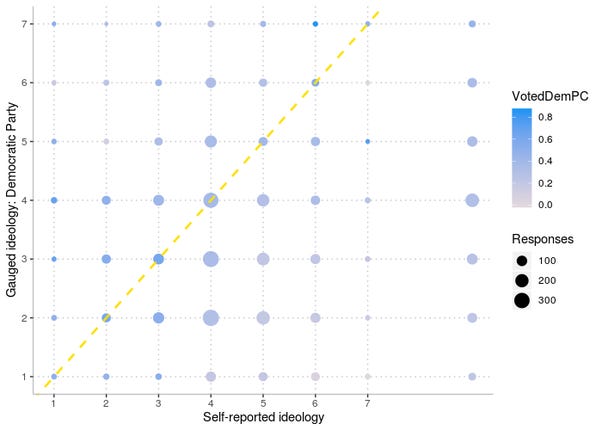 A short primer on reading these graphs: X axis is respondent’s ideology, self-reported. Y axis is respondent’s view of the Democratic or Republican Party’s ideology. The size of the dot is the number of swing voter respondents who fall on that particular intersection; its colour indicates the proportion of those that ends up voting for that particular party.