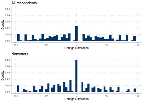 There is a visible peak at 0 (i.e. the respondent rates the two candidates equally) and a distribution of partisans on either side.