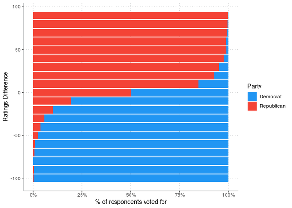 Highly Democratic or highly Republican partisans aren’t really voting for the other party - but that shouldn’t really be surprising. And the obvious correlation between the thermometer rating and voting likelihood is, as Mayer says, more reassuring than illuminating. The key insight is this: there really isn’t a whole lot of persuasion going on. If a voter rates one of the candidates better than the other by more than 15 points, they are more than 90 per cent likely to vote for that candidate.