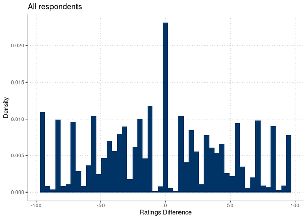 First, we create a metric to judge how a respondent compares the two candidates. For this, we can subtract the thermometer rating for the Democrat from that of the Republican (so, a rating of +100 indicates a respondent heavily favouring the Republican, and a rating of -100 indicates a respondent heavily favouring the Democrat). Here’s what the distribution of the ratings difference looks like: