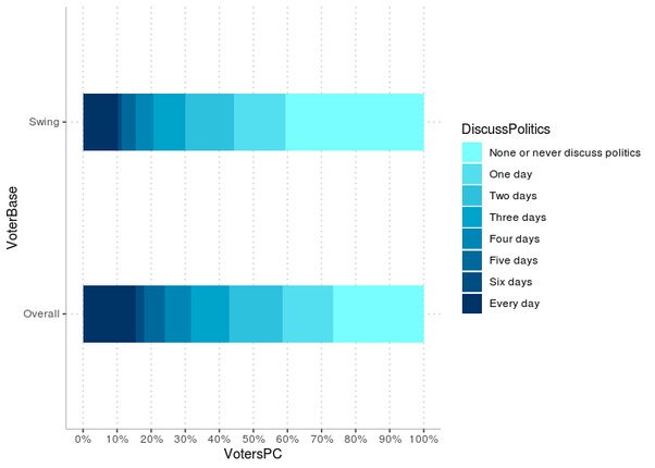 More than 40 per cent of swing voters report not discussing politics in the last week, compared to about 26 per cent overall.