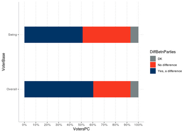 4. Swing voters are less likely to see a difference between what the two major parties stand for, by about 9 percentage points.
