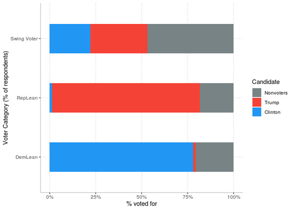 Democratic Leaners who voted - people who rated Clinton more than 15 points higher than Trump - went overwhelmingly for Clinton, about 98%. Republican leaners, when they did, voted overwhelmingly for Trump, again about 98%. Only about half of swing voters surveyed voted - but those who did broke 60–40 for Trump.